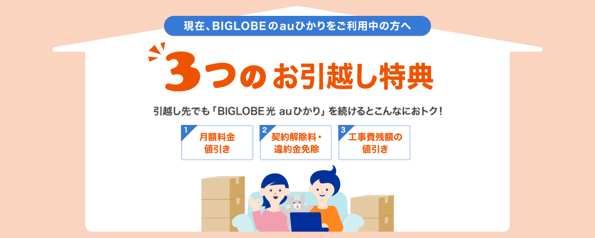 引越しの手続きは引越しの1カ月〜2カ月前を目安に始めてください。 対象期間中に本ページより「BIGLOBE光 auひかり」コースへお申し込みいただき、お申し込みから6カ月以内にauひかりサービスを開始され、引越し先のauひかりサービス開始月の翌月を1カ月目として11カ月目まで継続してご利用いただいた方が対象となります。期間中にコース変更、解約、サービス停止、再度引越しされた場合は特典対象外となります。