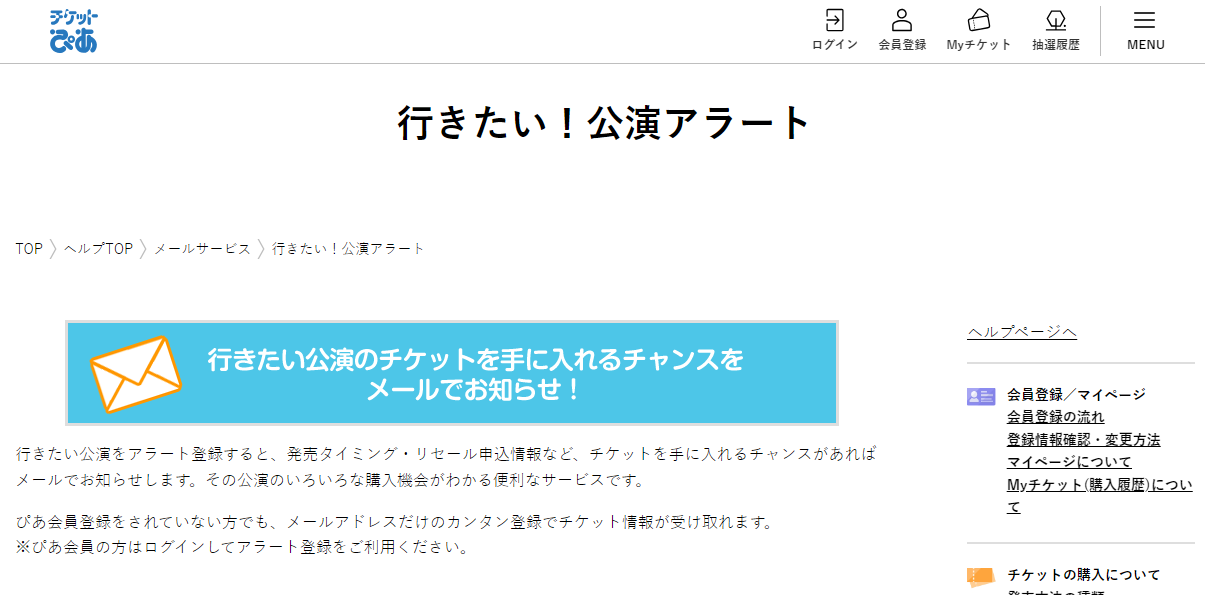 ▲「チケットぴあ」の「行きたい!公演アラート」についての説明ページ