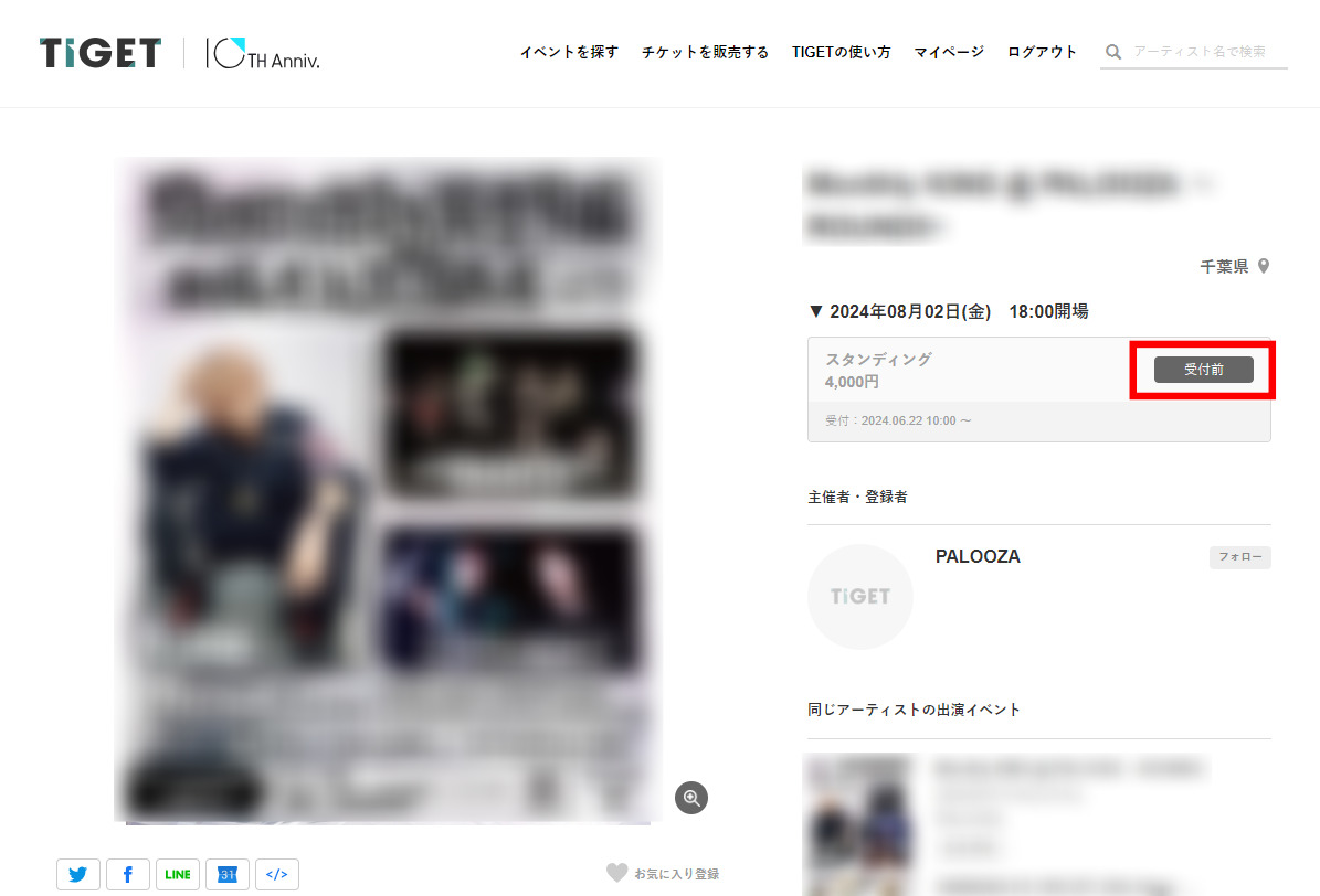 ▲画像はTIGETのイベントページ。ボタンはグレーアウトした「受付前」の表示になっています