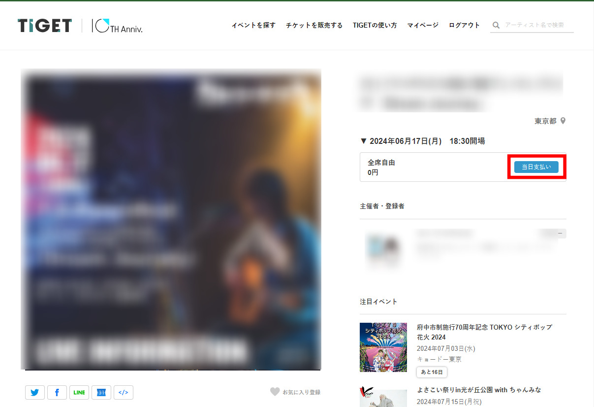 たとえばTIGETでは、時間になると「受付前」のボタンが「事前支払い」や「当日支払い」などに変わり買えるようになります。