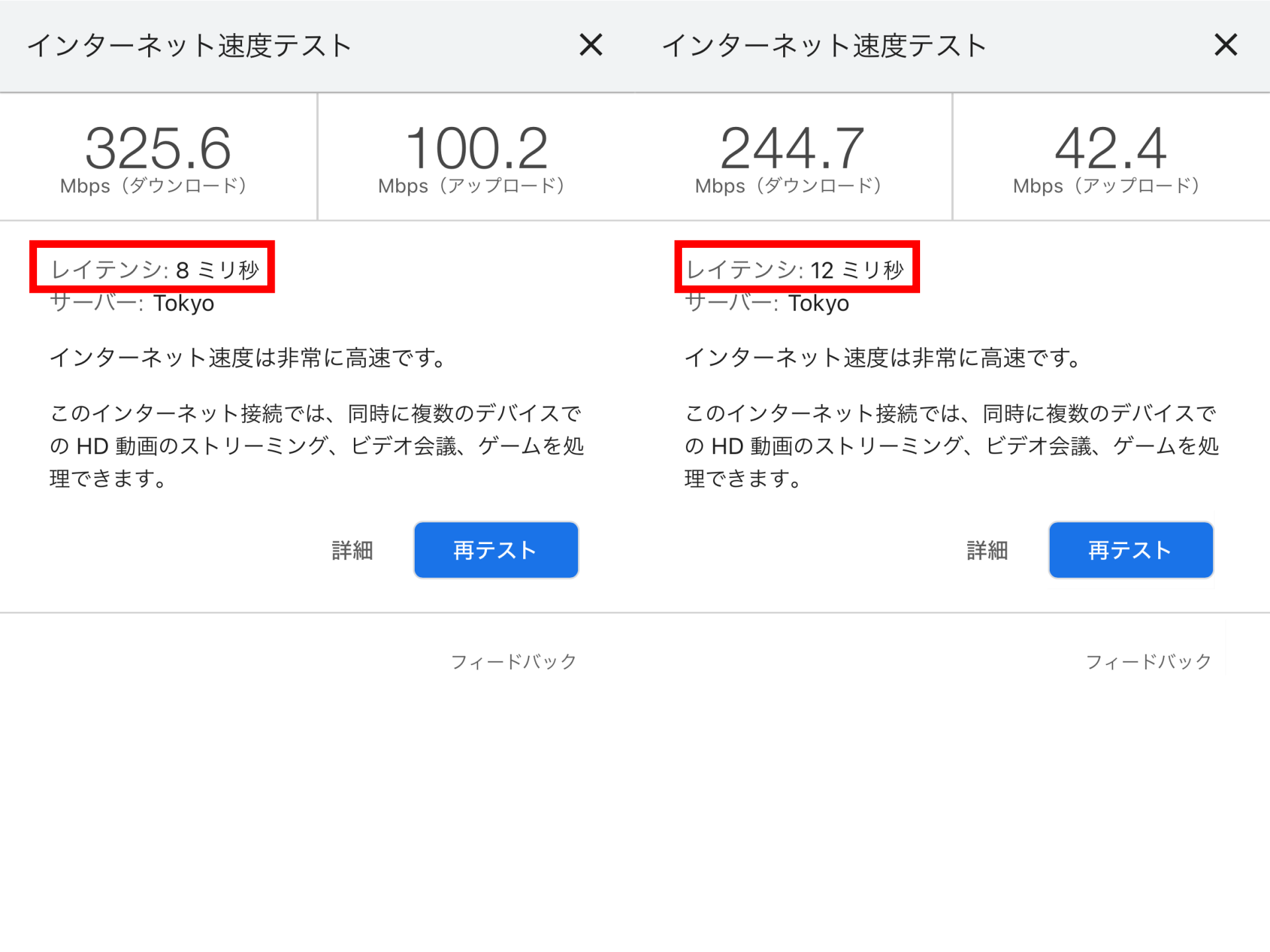 ▲左は自宅の固定回線でテストしたもの。右はモバイル回線。Ping値の大きさに注目