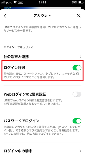 サブ機を設定する際には、最初にメイン端末の方の設定で「他の端末との連携」>「ログイン許可」をONにしておきましょう。