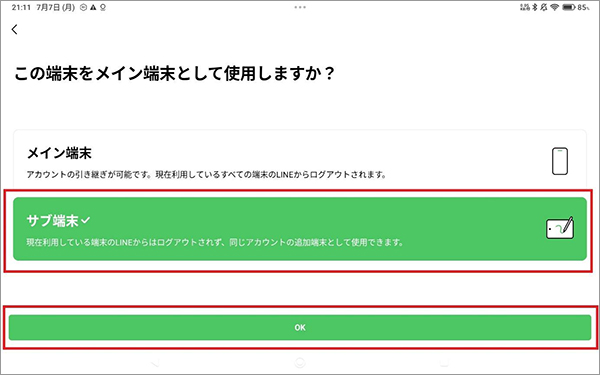そして、サブ機として使いたいデバイスでLINEアプリをインストールし、アプリを開いてログインをタップし、サブ端末を選択して「OK」をタップします。