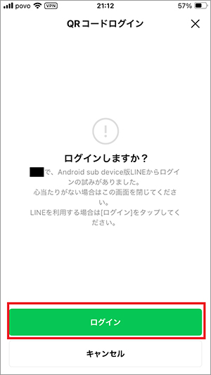 次のログイン方法を選択する画面に移り、QRコードかパスワードを選択しましょう。QRコードの場合にはメイン端末で友だち追加するときと同じ方法で読み取ります。