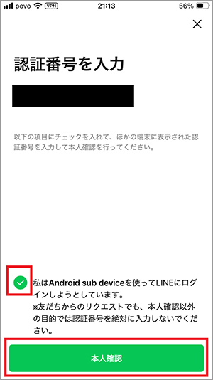ログインの確認をした後に認証番号がサブ端末に表示されるので、メイン端末で入力して注意書きにチェックを入れ本人確認のところをタップしましょう。そうすると、トーク履歴の同期が行われて、メイン端末と同じように使えるようになります。