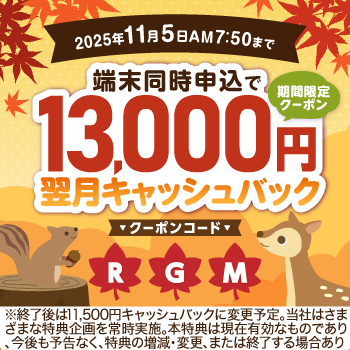 「データ端末+SIM」のお申し込み時にクーポンコード「RGM」のご入力で13,000円キャッシュバック。
